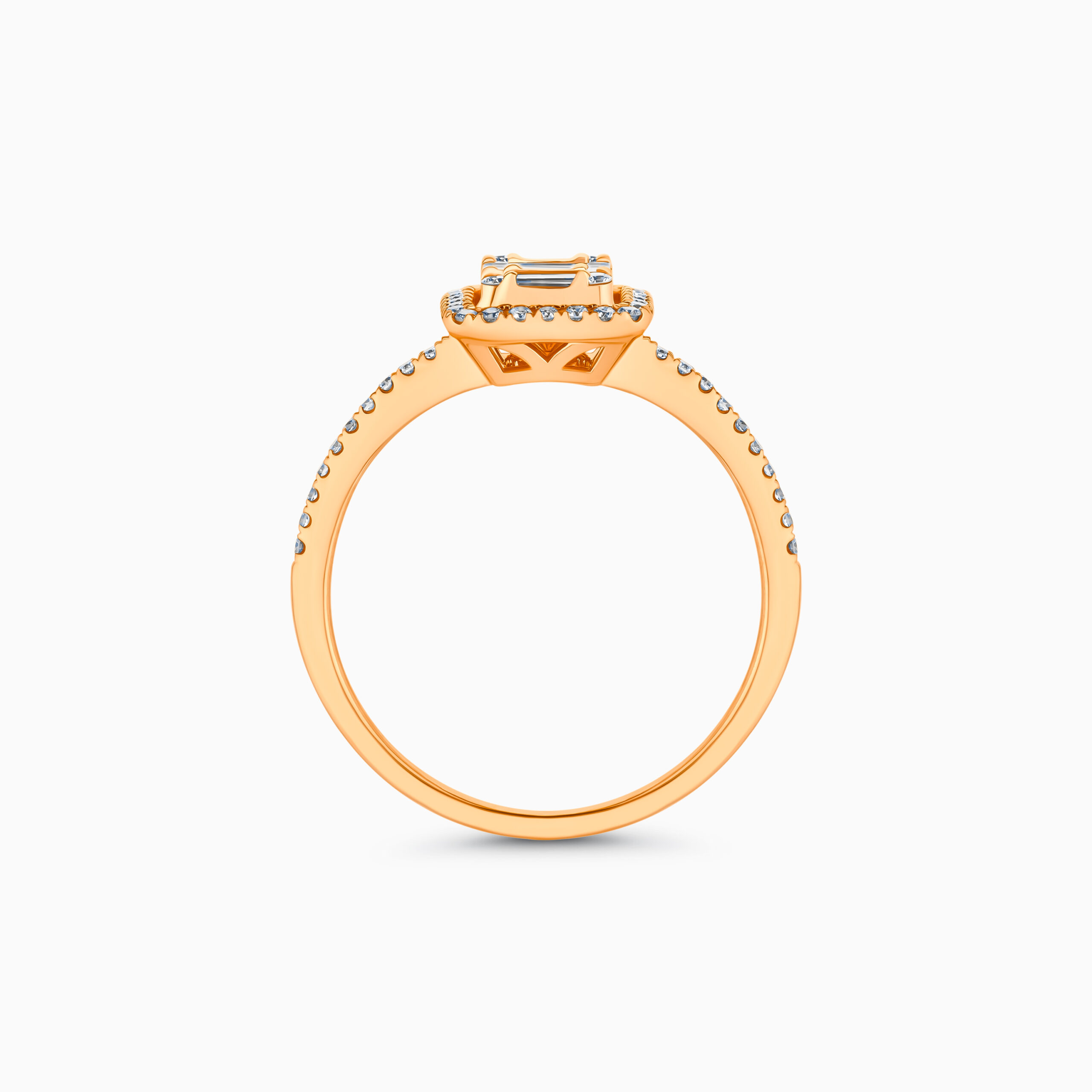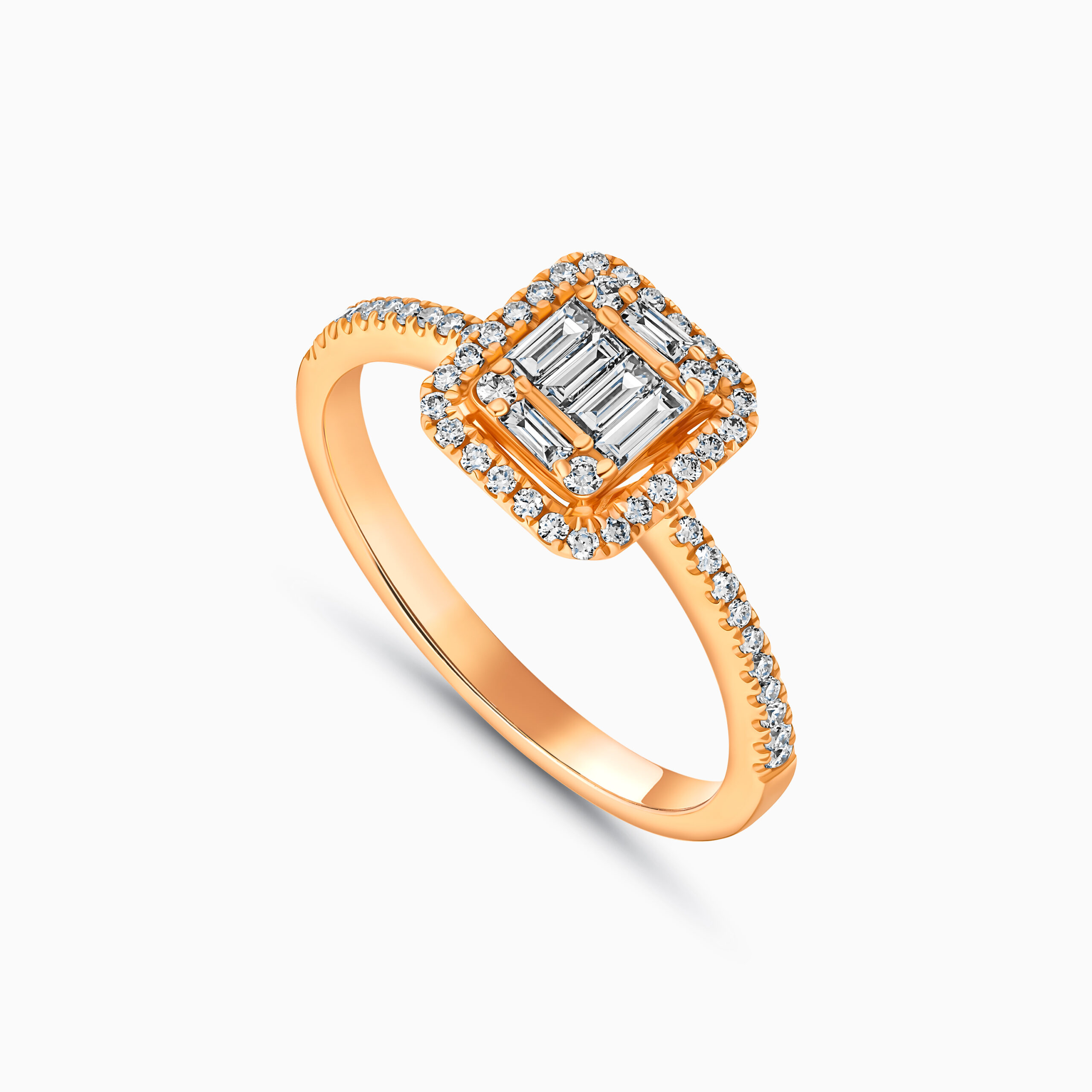 A stunning halo cluster design in 18K rose gold, featuring 56 diamonds with a 0.39 carat total weight. The center boasts 6 baguette-cut diamonds for a brilliant, elegant finish.