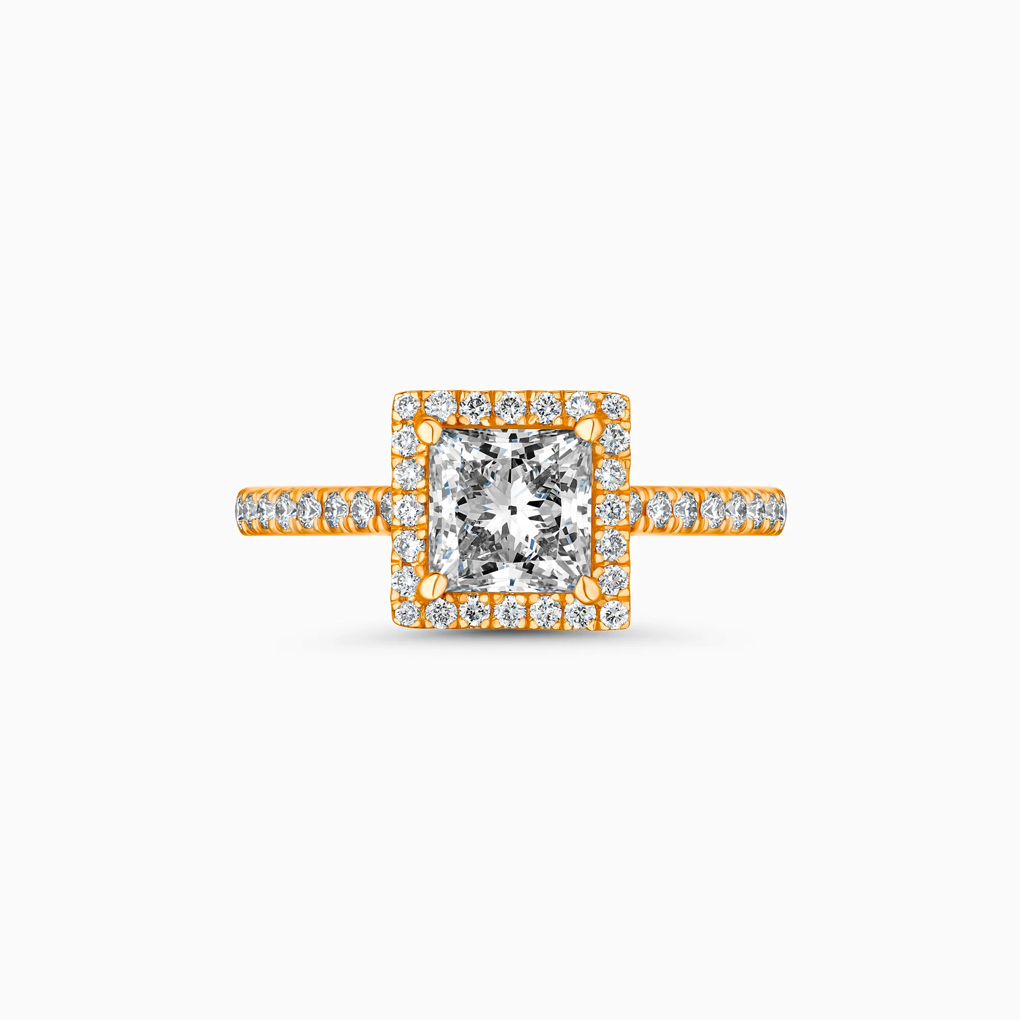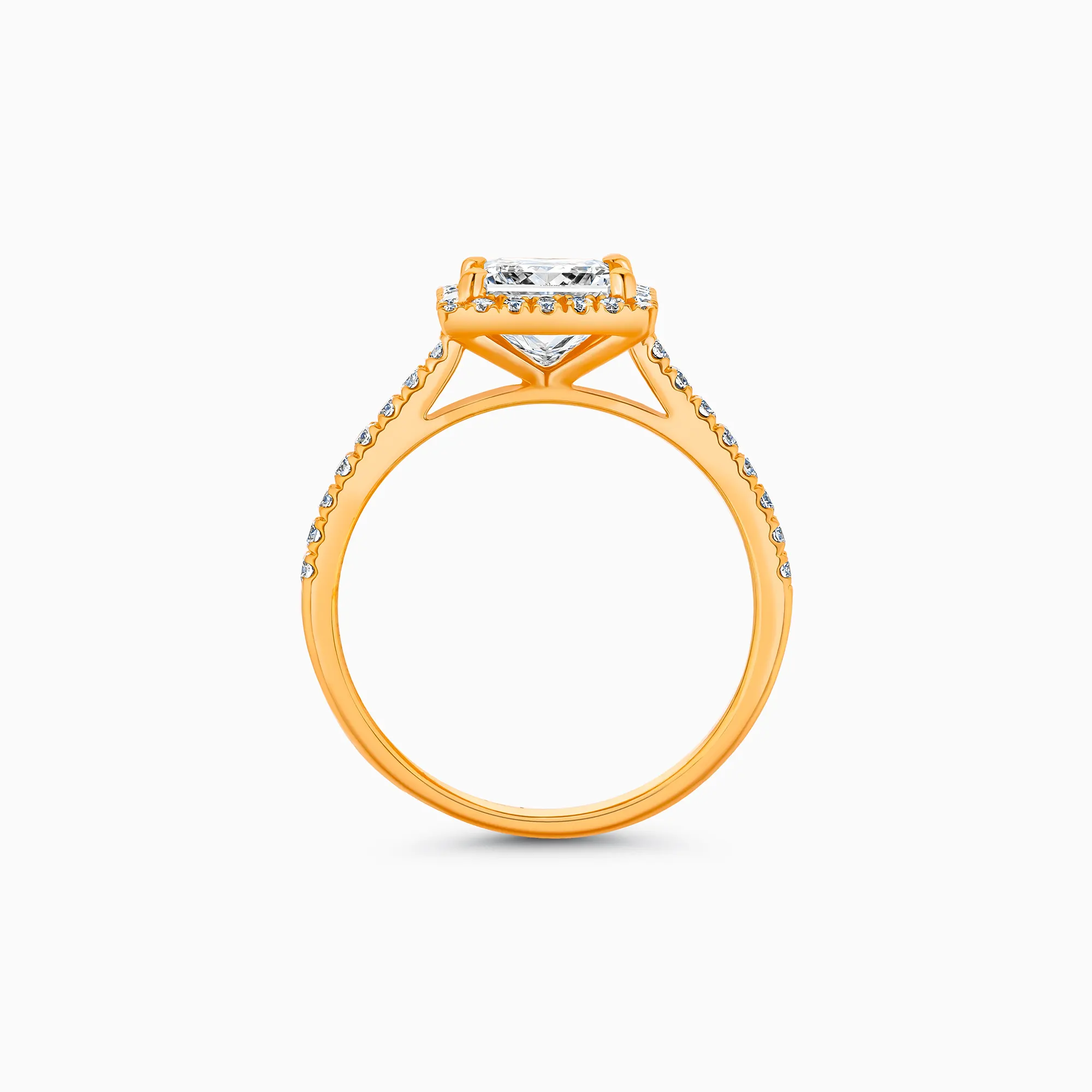 Design: The princess classic halo setting showcases a 1.54-carat princess-cut center diamond, surrounded by 40 round side diamonds in a halo design.